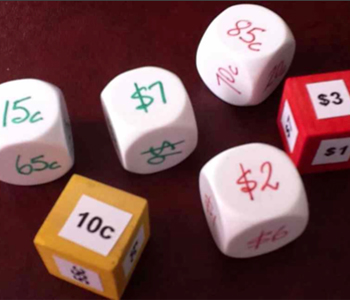Students play with money dice, plastic dice or small wooden blocks, on which amounts of money are written on each side. The amounts may vary according to the ability of the students to add to numbers together. Optional sets can be made representing Japanese and Singaporean money.