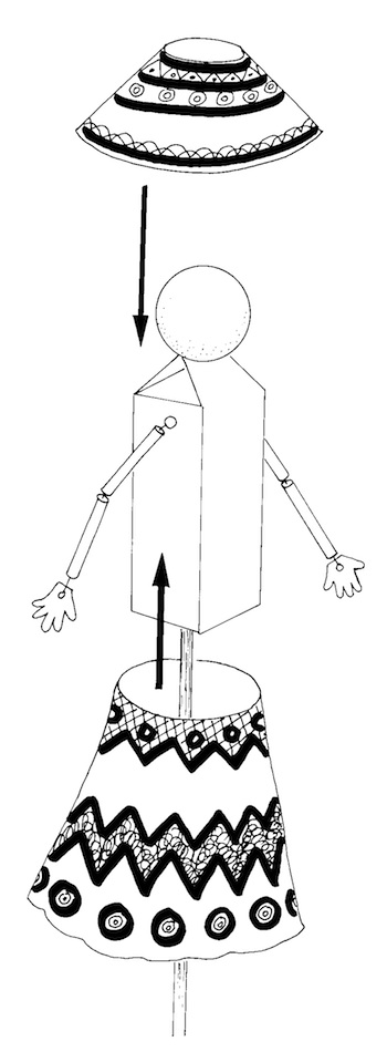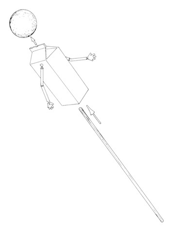 Props: percussion instruments, cut-out palm trees and houses, camera flash bulb